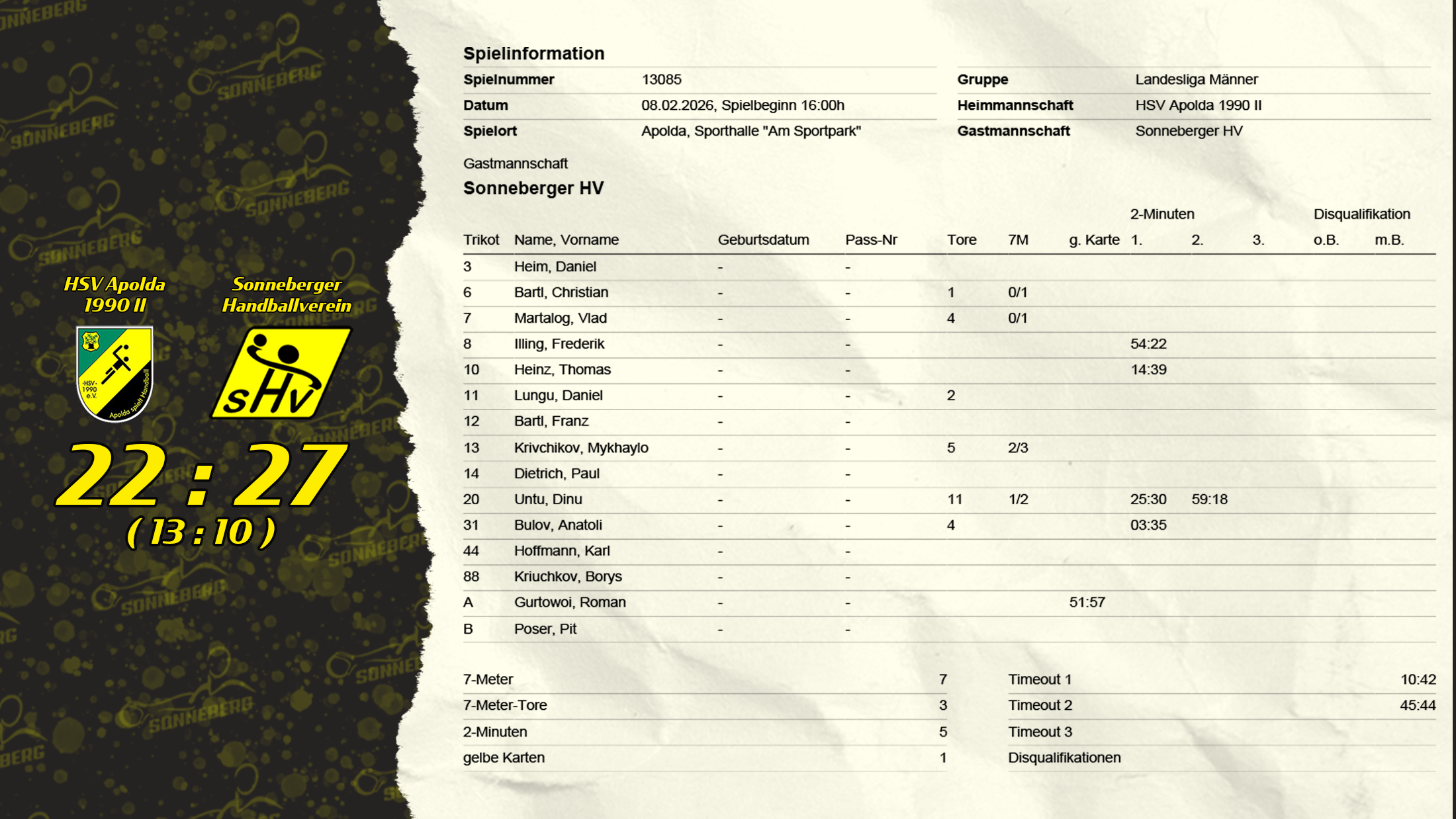 Sonneberg: Kriuchkov; Heim, C. Bartl (1), Martalog (4), Illing, Heinz, Lungu (2), F. Bartl, Krivchikov (5/2), Dietrich, Untu (11/1), Bulov (4), Hoffmann