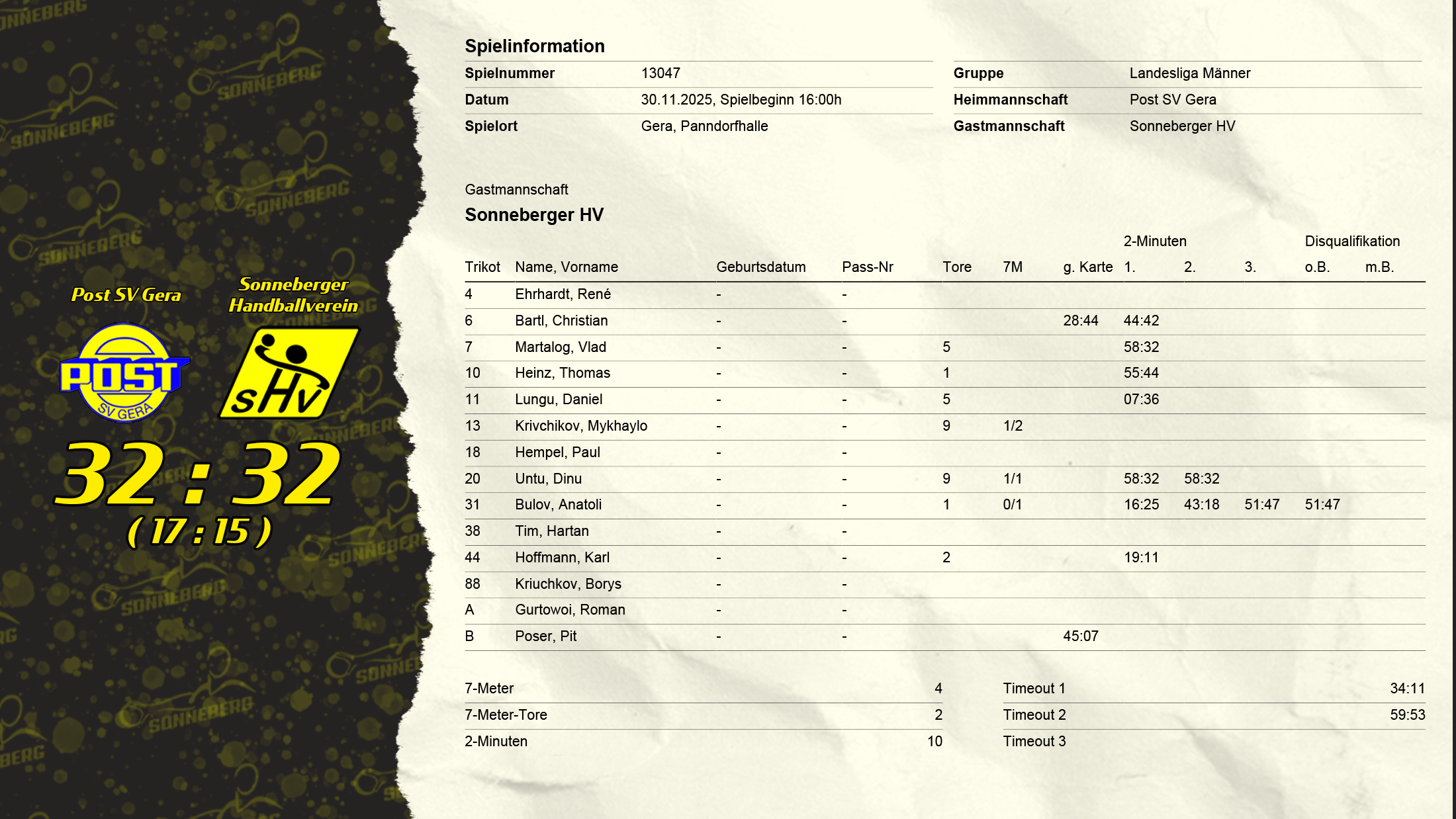 So endete die Partie mit einem gerechten Unentschieden. Die Sonneberger waren am Ende durchaus zufrieden mit dem Ergebnis gegen eine Mitfavoriten der Landesliga Thüringen und gleichzeitig sah das Trainerteam noch viel Verbesserungspotenzial. Gerade die Defensive zeigte erfreuliche Fortschritte, gerade in den letzten 15 Minuten ließ sie nur 5 Tore zu. Darauf heißt es jetzt aufbauen und am besten direkt beim nächsten Heimspiel am 06.12.2025 .