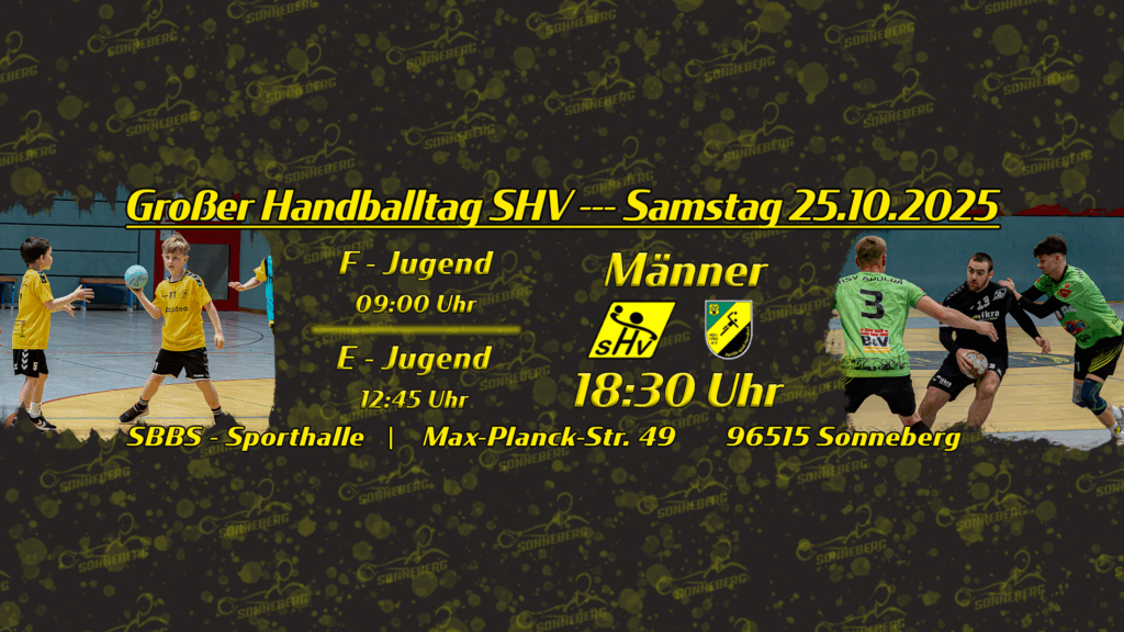 Für die Sportler des Sonneberger Handballvereins (SHV) steht am kommenden Samstag wieder ein Großkampftag in der heimischen SBBS-Halle an. Los geht’s bereits ab 9 Uhr mit den Turnieren der F-Jugend. Zu Gast sein werden dazu die Sportfreunde von der HSG Suhl , HV...
